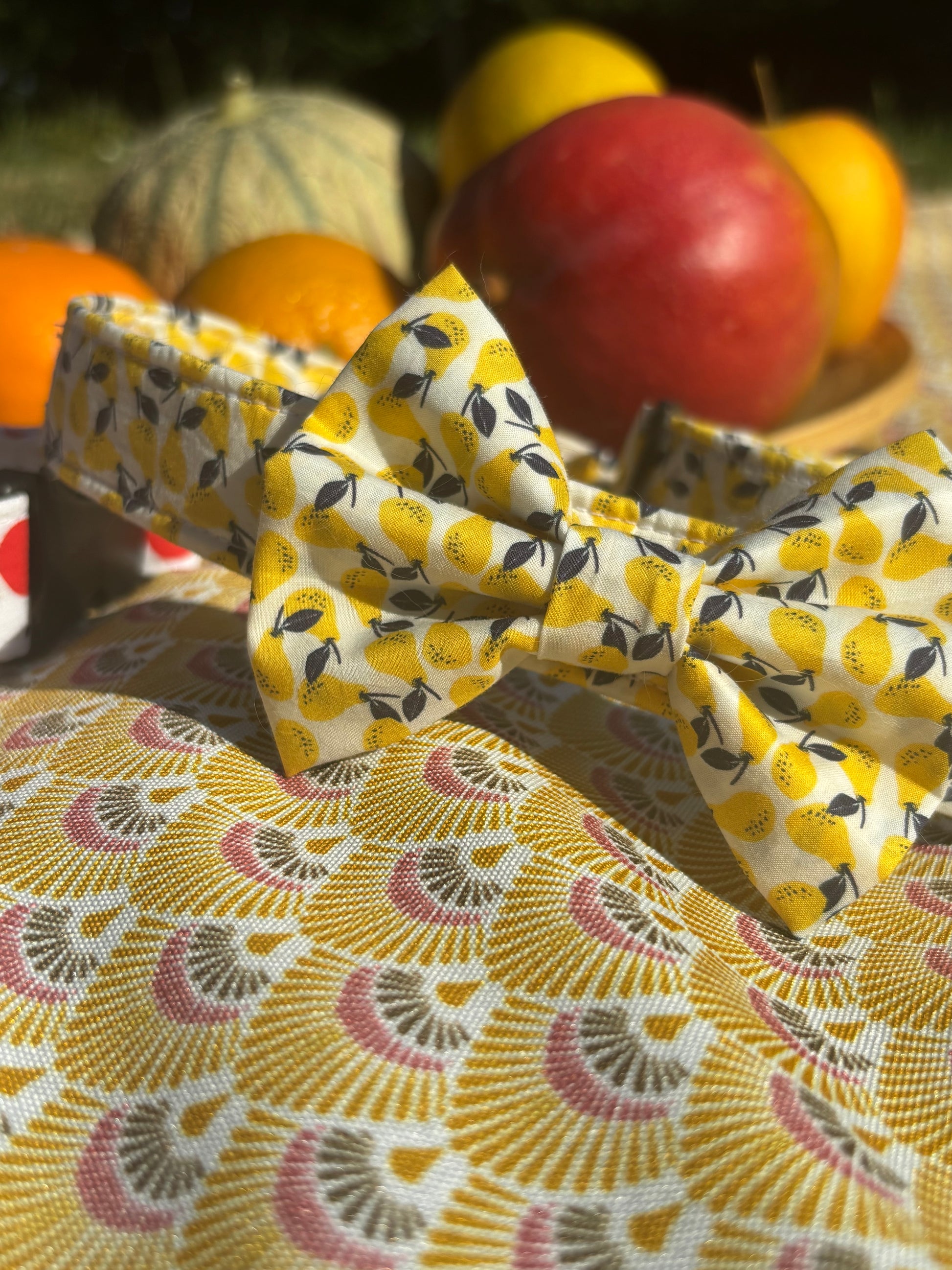 Les nœuds sont réalisés avec un joli tissus 100% coton ( tout doux pour votre chien, pas de risque d'irritation) et 2 élastiques à l'arrière du nœud pour pouvoir y passer votre collier.