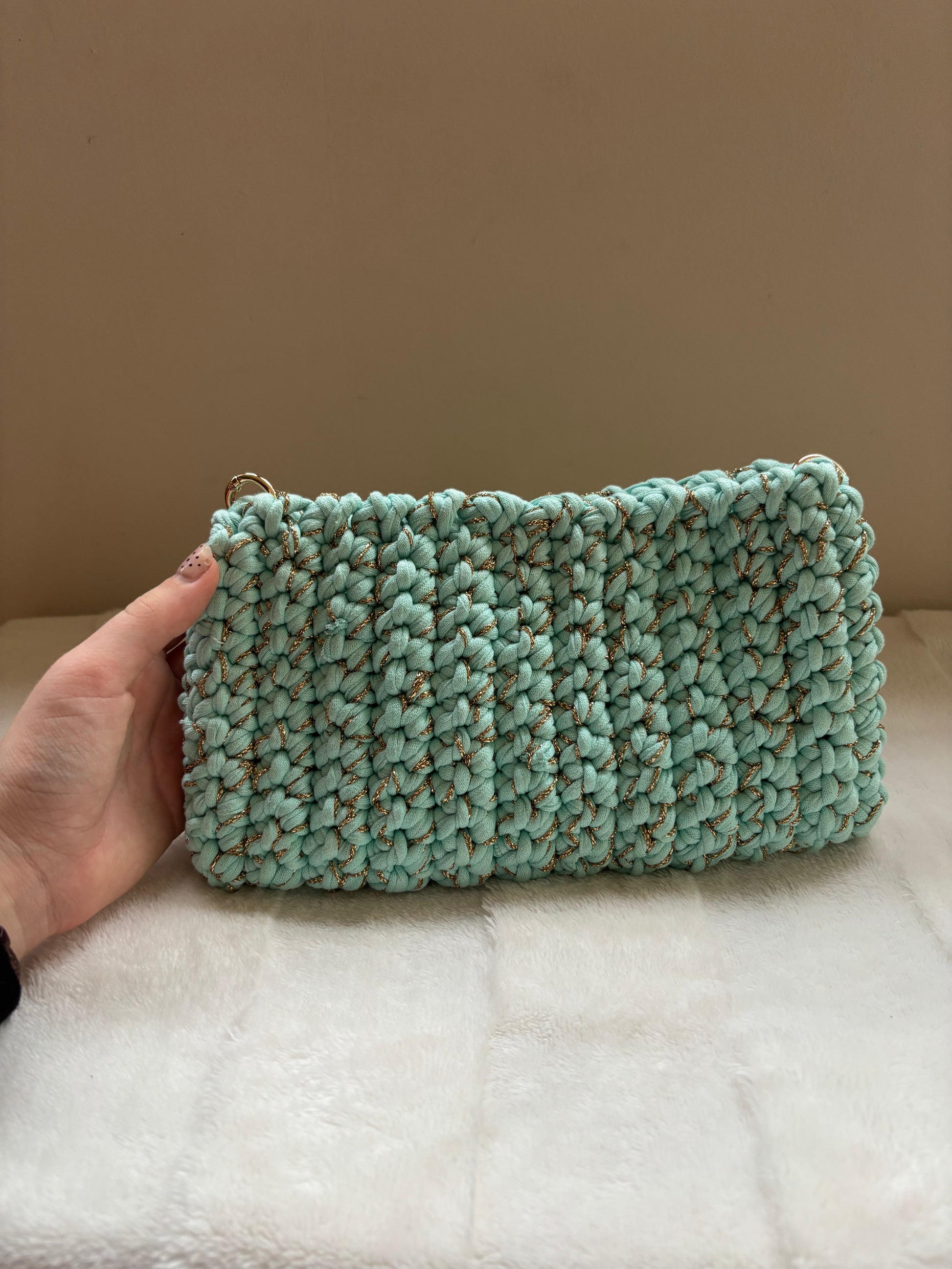 Ce sac pochette est composé d'un joli fil menthe et d'un fil doré